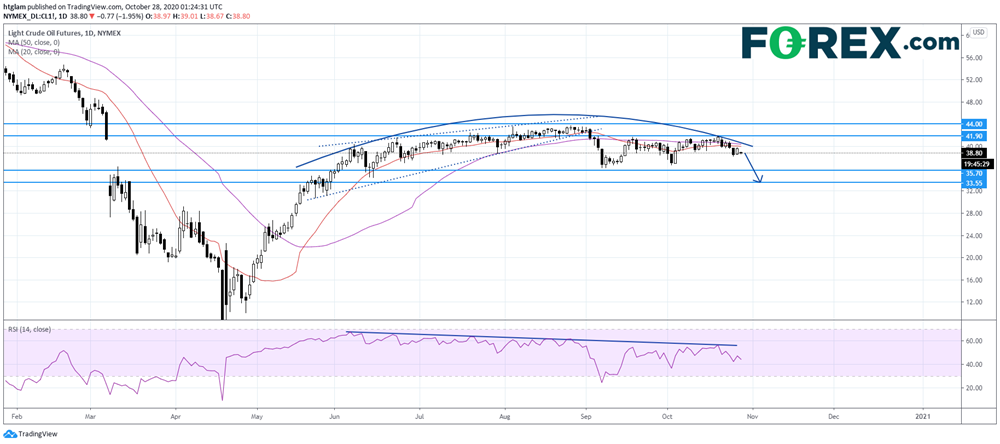 从技术角度来看,WTI原油期货(12月)的压力正在增加,如日线图所示。以前,它已经跌破了看跌的上升楔形形态,现在正在形成一个圆形的顶部形态。41.90美元的水平可能被认为是最近的阻力位,而第一支撑位和第二支撑位预计分别位于35.70美元和33.55美元。
