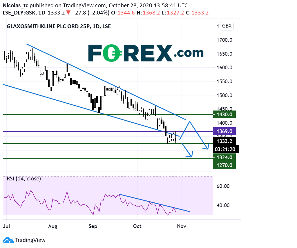 从技术角度来看,股价仍处于20DMA限制的下降趋势中。价格填补了10月22日打开的看跌缺口,并且将其下跌趋势恢复至1369p(内部趋势线)的阻力下方。每日RSI仍受趋势线下降的限制。跌破1324p的摆动低点将为进一步下跌至1270p(斐波那契)开辟道路。或者,将价格推高至1369p将要求有限地向上攀升至1430p的阻力位。